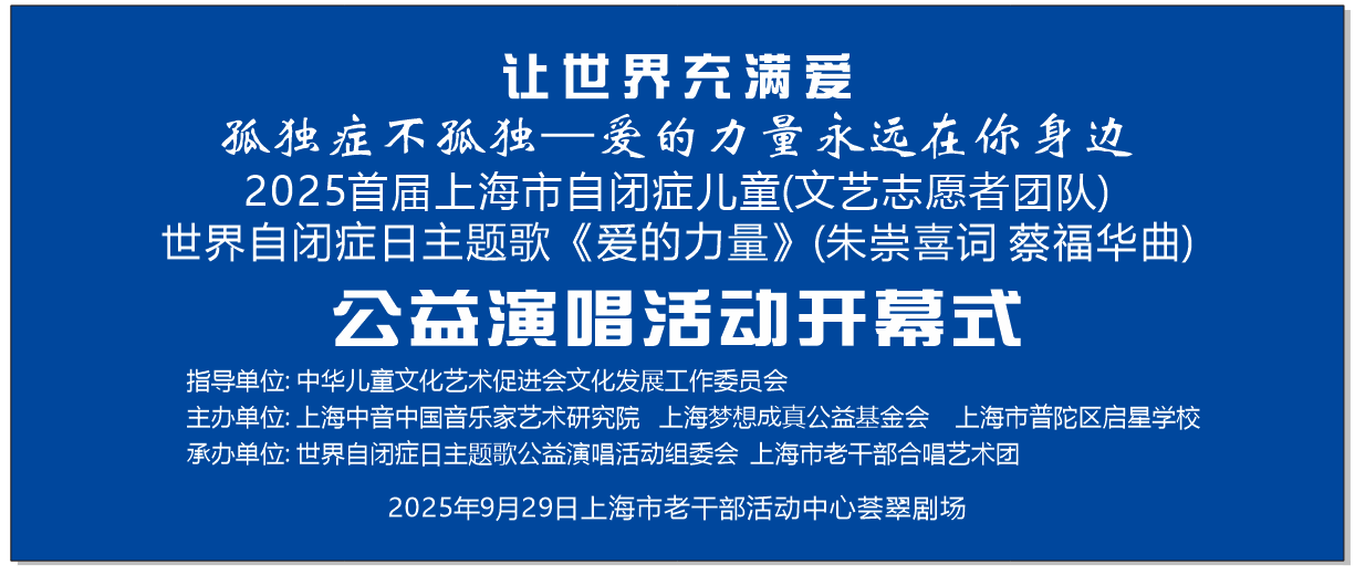 9月29日秋风气爽,在上海市老干都活动中心荟萃剧场隆重上演了一场由中华儿童文化艺术促进会文化发展工作委员会指导、上海中音中国音乐家艺术研究院、上海梦想成真公益基金会和上海市普陀区启星学校联合主办的“孤独症不孤独--爱的力量永远在你身边2025首届上海市自闭症儿童(文艺志愿者团队)“世界自闭症日”主题歌《爱的力量》公益演唱活动开幕式。