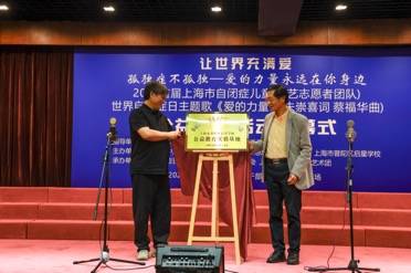 开幕式上,蔡福华将这套《自闭症儿童音乐训练十四法》与普陀区启星学校校长范敏共同为“十四法普陀区启星学校公益教育实验基地“揭牌。